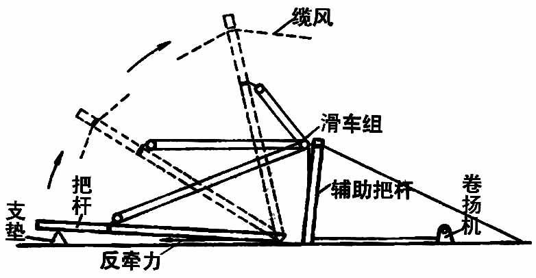 木独脚扒杆由梢径20~32cm的独根园木制成,现在已少使用;