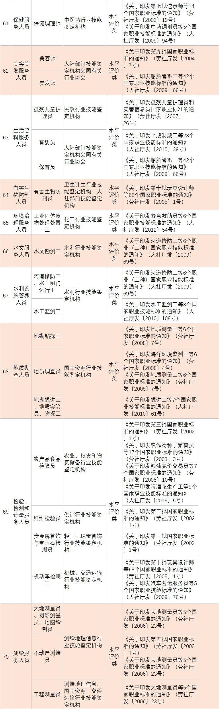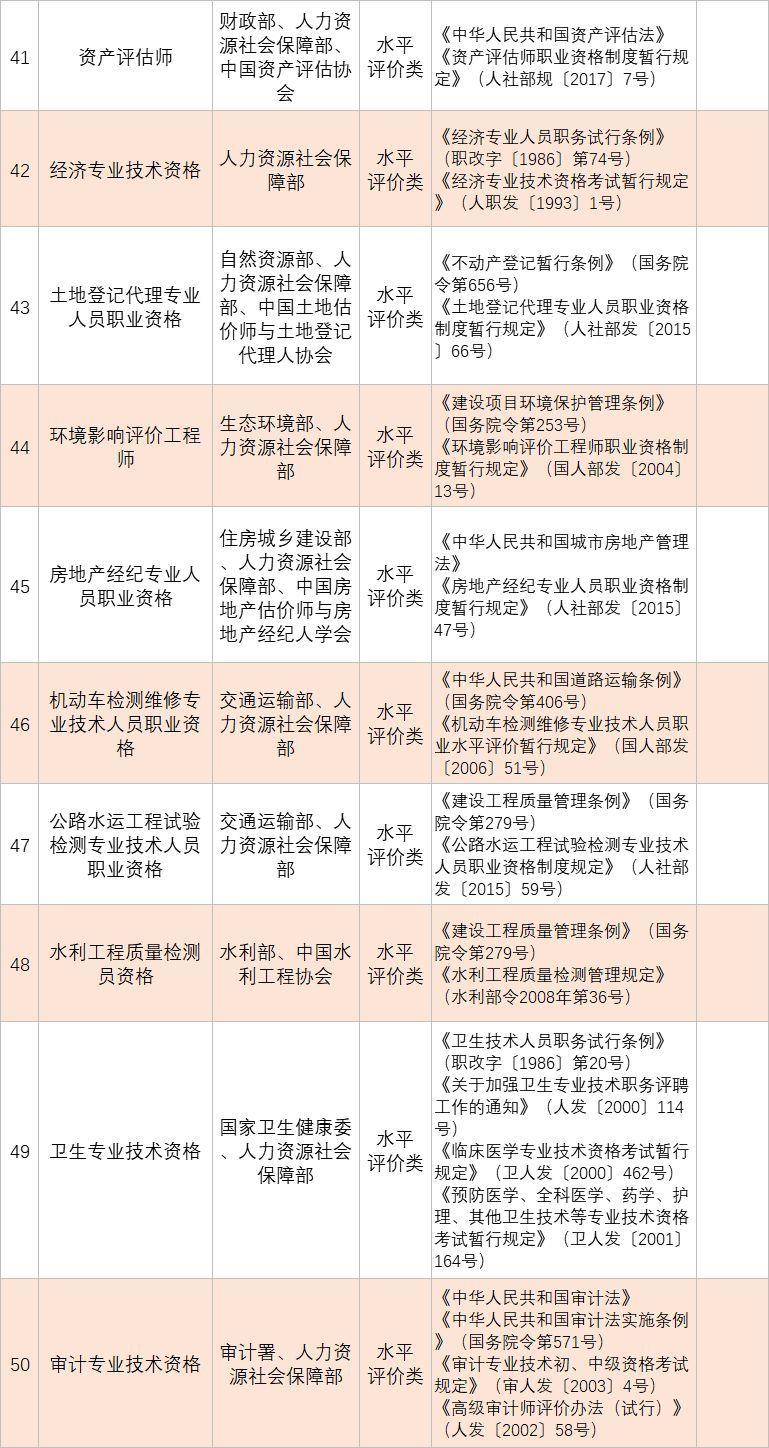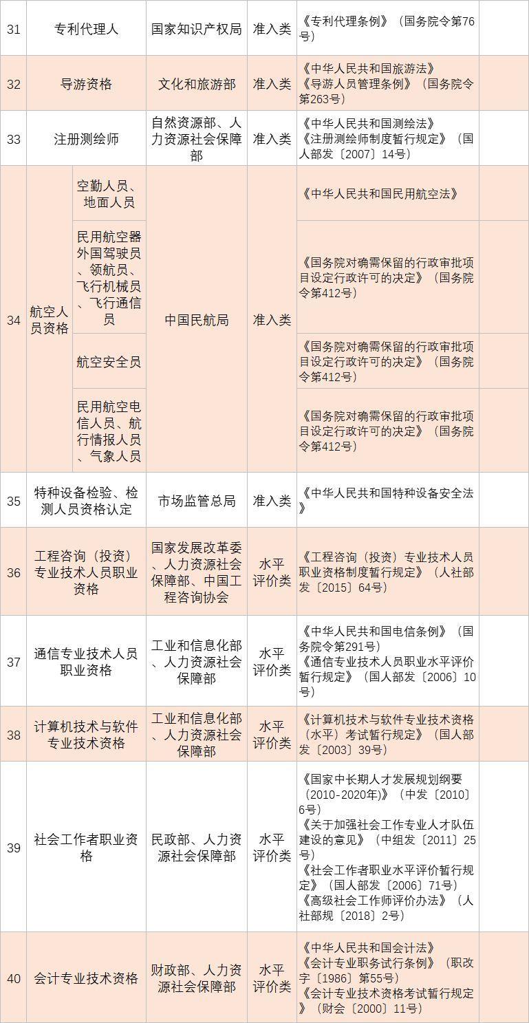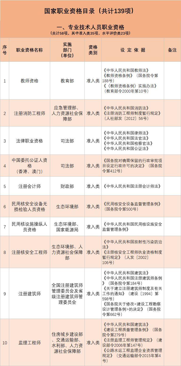 其中专业技术人员职业资格58项,其中准入类35项,水平评价类23项;技能人员职业资格81项,其中准入类5项,水平评价类76项。 这些职业资格基本涵盖了经济、教育、卫生、司法、环保、建设、交通等国家重要的行业领域,符合国家职业资格设置的条件和要求。 准入类职业资格关系公共利益或涉及国家安全、公共安全、人身健康、生命财产安全,均有法律法规或国务院决定作为依据; 水平评价类职业资格具有较强的专业性和社会通用性,技术技能要求较高,行业管理和人才队伍建设确实需要。