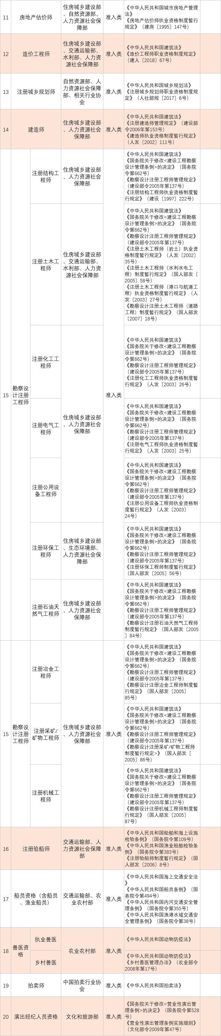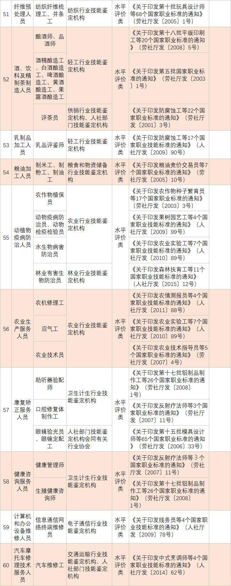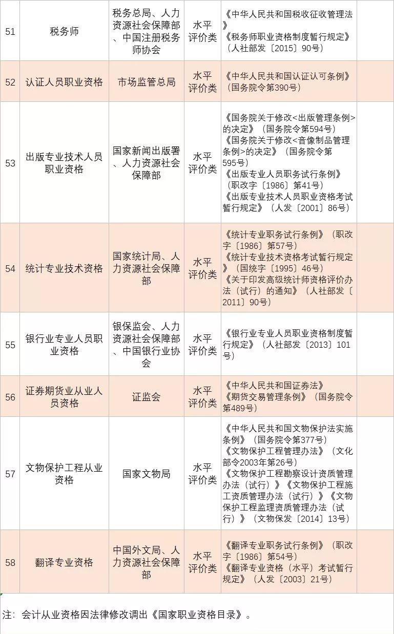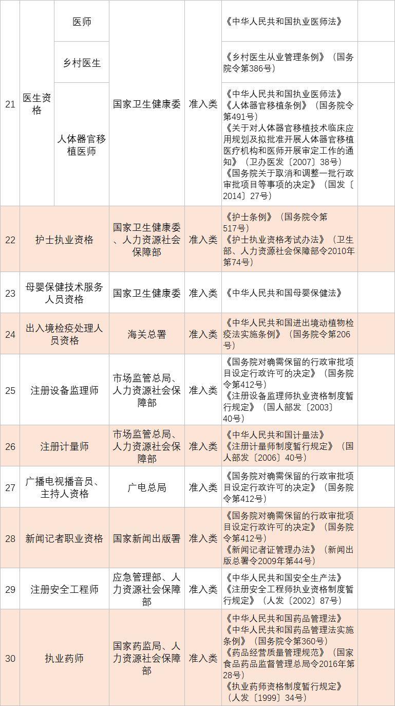 其中专业技术人员职业资格58项,其中准入类35项,水平评价类23项;技能人员职业资格81项,其中准入类5项,水平评价类76项。 这些职业资格基本涵盖了经济、教育、卫生、司法、环保、建设、交通等国家重要的行业领域,符合国家职业资格设置的条件和要求。 准入类职业资格关系公共利益或涉及国家安全、公共安全、人身健康、生命财产安全,均有法律法规或国务院决定作为依据; 水平评价类职业资格具有较强的专业性和社会通用性,技术技能要求较高,行业管理和人才队伍建设确实需要。