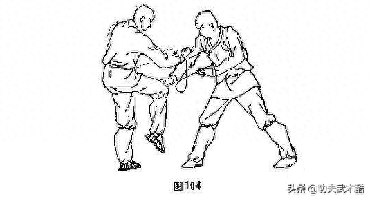 ①乙上右脚用其右手向甲腹部打来,甲撤左脚,提右脚,盖右拳压住乙的右手(图104)。