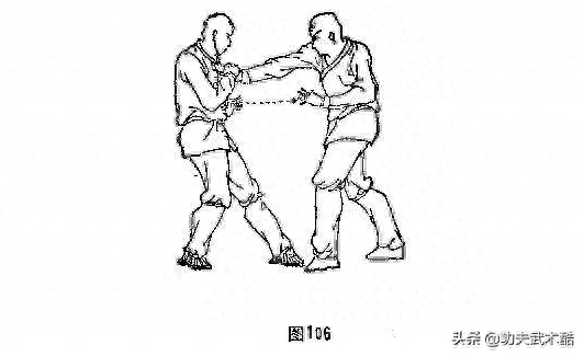 ①乙用其右手从正面抓甲脖领,甲撤右脚,体向右扭,甲右手按住乙右乎,防乙撕破甲的脖领(图106)。