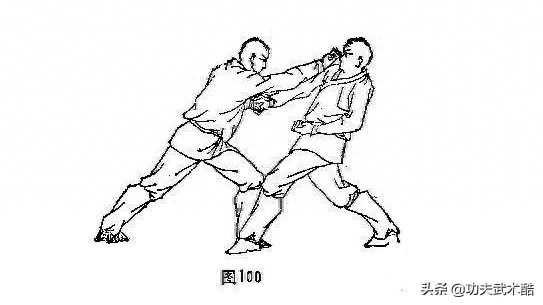 乙上左脚用其右手向甲打来,甲左手搂勾引开,而甲右乎用阳拳或中指点乙的人中穴,同时甲左脚上步,拧腰顺肩,以助其力(图100)。