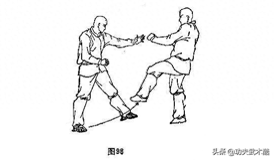 ①乙用其左脚向甲踢来,甲微撤右脚,缩身躲开(图98)。