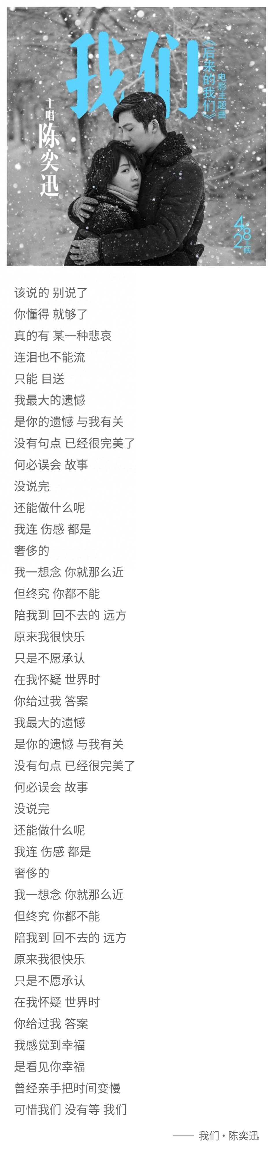 通过奕迅的嗓音,完美的诠释了:当下这个社会大多数人没有认清的一个事实。后来的我们,没有后来,也没有我们。