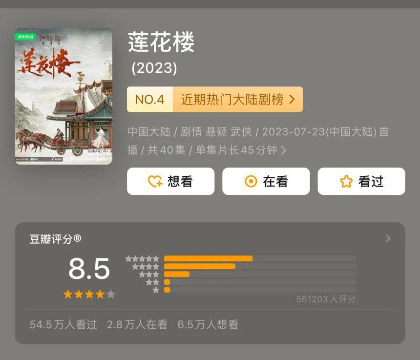 更别说衡量成功的标准满坑满谷:票房不行还有豆瓣分,豆瓣分不行还有猫淘分,都不行还有新闻联播嘉奖与央视盖章,全都无?那看看各种正规奖野鸡奖有无提名和获奖?剧集就更容易了,收视率不行还有网播,播出成绩不行还有热搜,云合酷云 V 榜德榜骨朵艺恩灯塔,总有能框死别人激活自己的榜单,把这所有限定词往上一罗列,谁还框不出个 " 唯一 " 和 " 最好 " 呢?