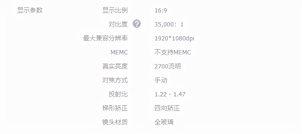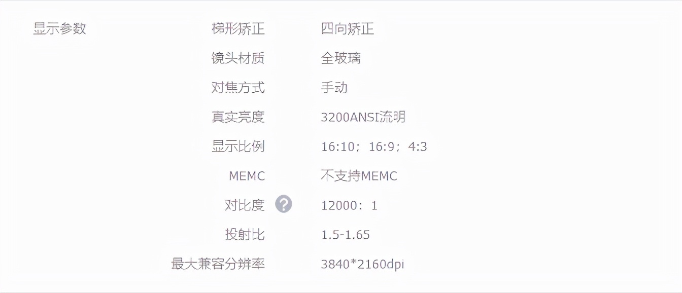 需要注意的是,投射比可以是一个范围,也可以是一个定值。当它是一个定值时,意味着这台投影机采用的是定焦镜头,投影距离固定了,画面大小也就固定了。