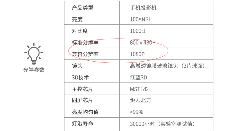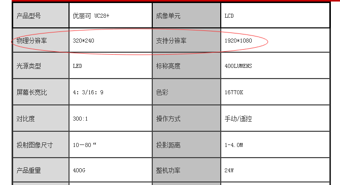 正因为“分辨率越高越好”是普遍的共识,有些投影机品牌开始想方设法“钻空子”,弄出“最高支持分辨率”“支持分辨率”“兼容最大分辨率”等混淆视听的概念。比如这台投影机的原生/物理分辨率只有320×240,但在参数列表中故意标着“支持分辨率为1080p”。