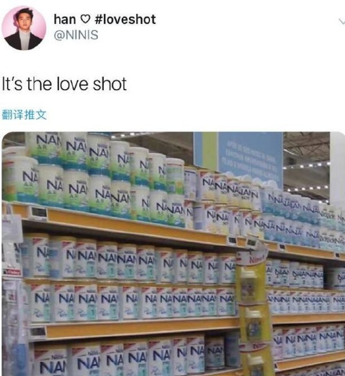 而最近一个爱丽在推特上晒出了一张超市奶粉货架的图片,从图片上来看满满一排的奶粉罐而奶粉的罐子上写着NA。而这样的一排奶粉罐让人忍不住的想唱“nananan……it's love shot”这位爱丽也是将这条推特配文“it's love shot”果然是最好的诠释了 love shot。也不得不感叹爱丽们的想法,但是这样看来这样的脑洞的确成立。