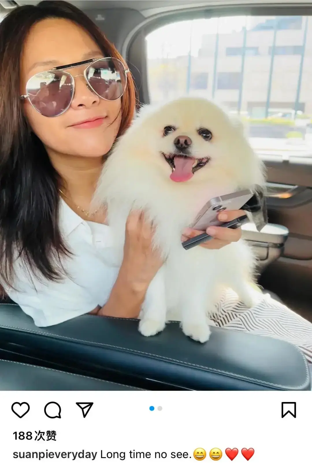 徐静蕾在个人社交平台上更新了动态,配文:long time no see 。配图是徐静蕾抱着一只纯白色的狗狗坐在豪车上。此文一出后,立刻引起网友们的关注。