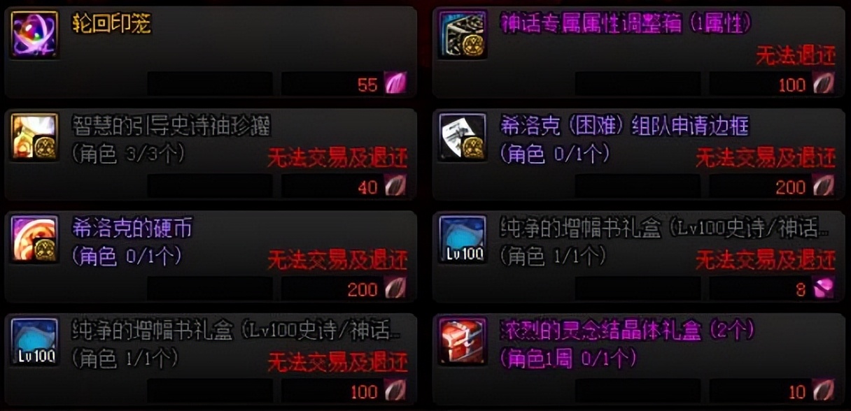 售价100不渝之咏,每周限制兑换6个,虽然只适用增幅+6及以下的装备,但是价值仍然非常高。