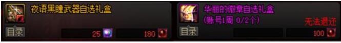 夜语黑瞳武器的外观都比较拉风,是幻化的不二选择,有兴趣的小伙伴们可以收集一下;徽章不足的玩家,也可以在普雷商店中使用100个材料兑换华丽徽章自选礼盒,每周限制兑换两次。