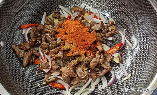 【步骤七】:调料炒出香味,放入炸好的肉片,同时放入辣椒面和孜然面,还有一勺生抽、鸡精。