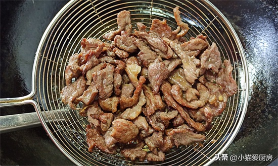 (4)炸的时间稍微久一点,一般大火炸1分钟左右,让肉片微黄就好,这样可以让肉片有一定的嚼劲,而且还不老。