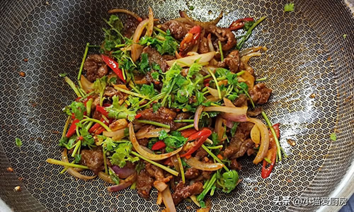 (5)香菜下锅关火炒,用余温炒就可以,炒久了香菜的香味会丢失。