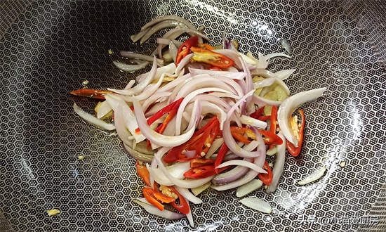 【步骤六】:锅中留底油,开小火,放入生姜蒜片、红辣椒、洋葱丝,小火炒出香味。