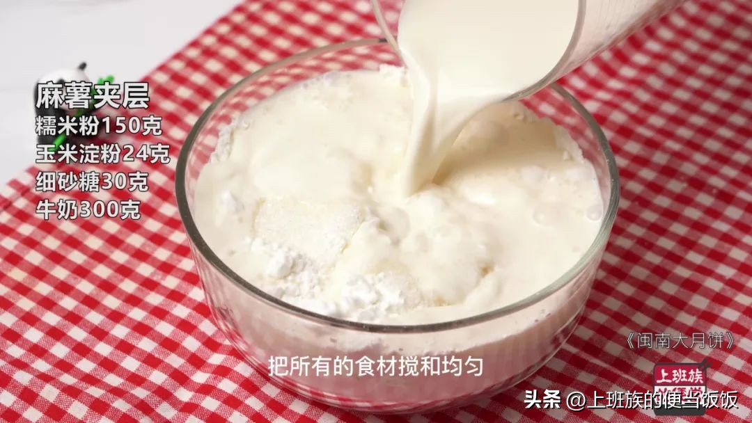 趁着这个时间来做麻薯夹层,把所有的食材搅合均匀,按照这个比例来巨好吃。