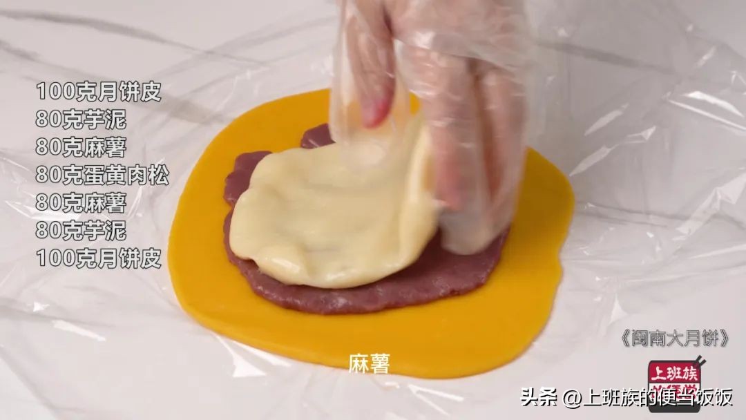 组装环节,先取100克的月饼皮,擀大擀开,不要擀太薄容易漏,叠加放上芋泥,麻薯,蛋黄肉松,再重复叠上麻薯,芋泥,饼皮,这样就会有一个7层的分层效果。