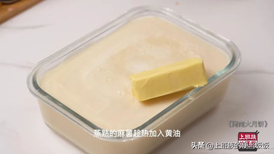 蒸熟的麻薯趁热加入黄油。