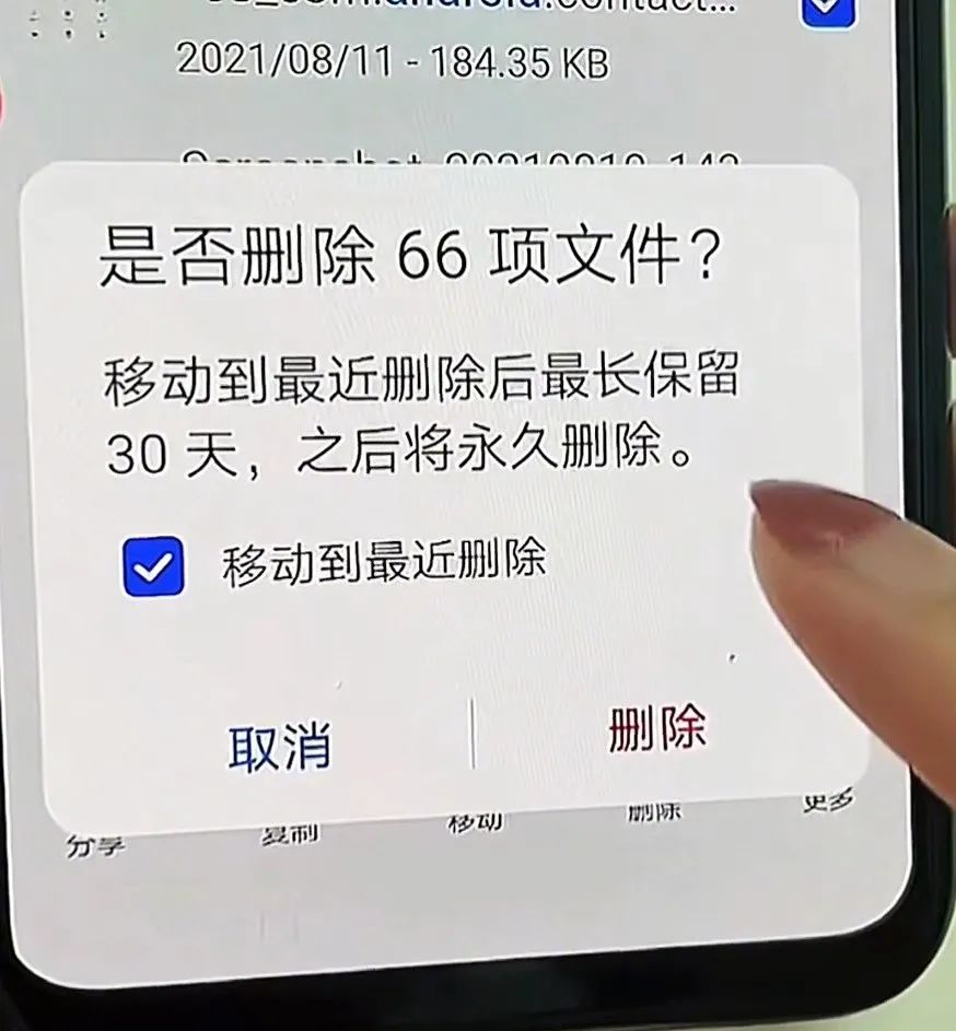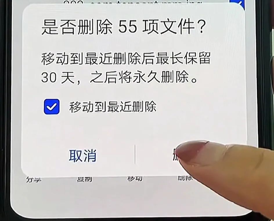 这些都是曾经的一些图片,都是不需要的,我们也是同样长按两秒,就会出来这个后面的小方框,然后我们给他勾选或者是全选之后,我们还是同样点击删除就可以,是否要删除这55项文件,也是可以删除之后,最长可以保留30天,之后将永久删除,我们就可以点击删除。