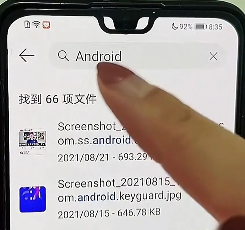 我们来搜索第一个可以删除的文件,我们在这个搜索框里输入android,这个文件并不是系统的文件夹,它存放的都是一些系统的缓存文件,都是可以删除的。我们搜出来有这么多的缓存文件,搜好之后,我们就可以长按这个文件名两秒,长按这个文件名两秒,后面就会出来小框,我们可以把它都选上。