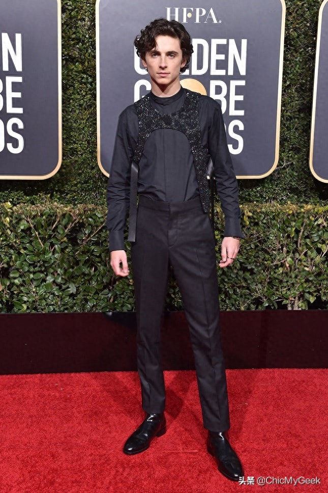 在参加2019年金球奖时,其他人则穿着传统西装礼服出席,他穿着一件布满缀饰的Louis Vuitton胸背束带。在《美丽男孩》的伦敦首映会上,他穿着Alexander McQueen的西装,上面装饰着大红色的花朵。如果男星们的红毯选择通常是同化和安全牌,甜茶这个直男似乎不介意做一些与众不同的造型。