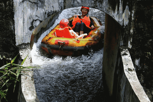起点从寨子山顶漂出后经过一段人工航道,穿过森林隧道、悬空漂道,从山顶速降冲入漂流最惊险的峡谷河段。
