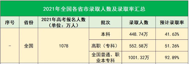 早在2021年教育部发布了的2020年全国教育事业发展情况文件中提到,全国普通本专科招生967.5万人,高考录取率首次超过90%(2020年全国高考人数约1071万人,录取率约90.4%),去年也就是2021年各省高考报名人数达1078万,是自1977年恢复高考以来报考人数最多的一年,比2020年增加7万人,已经是连续三年破千万了,创历史新高。另外2021年的高考录取率又有所上涨,总体的录取率从90.4%提高到92.89%。