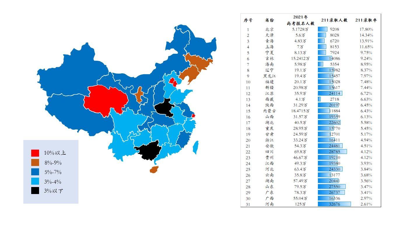 我们再去挖掘一下深层次的原因,我国地大物博,本身地域之间的教育水平就相差很大,加上城乡教育资源分配有差异,也是一个原因。因为中国高考是分省份录取的,而事实上每个省内也存在教育不平衡现象,而那些全省教育质量高,而部分落后的地区高考难度更大。以广西为例:广西教育比较发达的是南宁、柳州、玉林等市,而比较落后的是河池、北海、梧州、崇左等地。在教育资源相对落后地区的普通中学,有些学校可能连二本都考不了几个人。