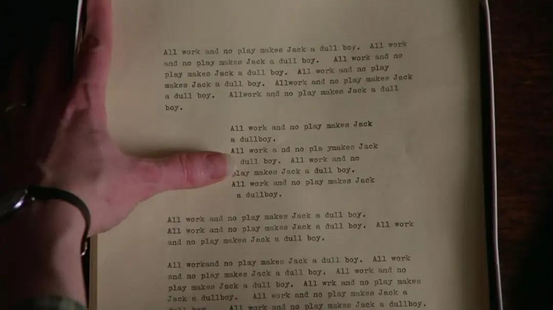 妻子发现丈夫这些天写的只有一句“all work and no play makes jack a dull boy(只工作不玩耍,使得杰克变得愚钝)”将影片恐怖的气氛推上了最高峰。