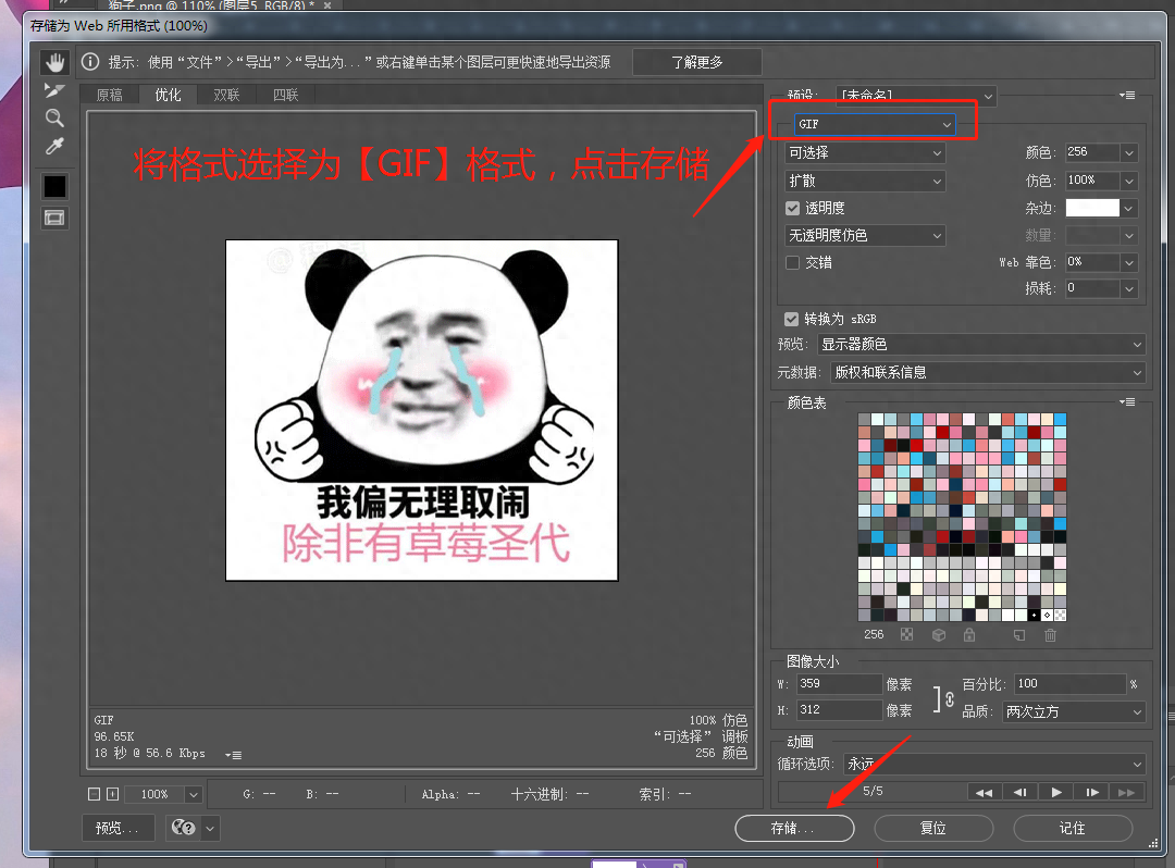 第五步,选择【文件】—【导出】—【存储为Web格式】,将储存格式改为【GIF】,这样我们的表情包就制作完成啦,是不是非常简单?