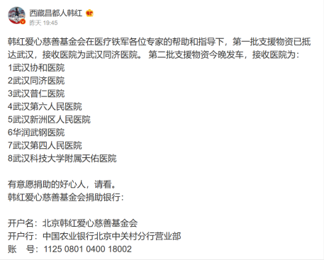 为武汉捐赠的明星其实有很多。比如韩红于1月25日,便以韩红爱心慈善基金会的名义为武汉的八家医院捐赠物资,并公开向大家表示有意愿捐款的可以捐给韩红爱心慈善基金会。