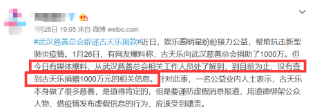 1月26日,针对古天乐为武汉捐款1000万一事,有媒体向武汉慈善总会求证,得到回复称并未查到古天乐捐赠1000万元的相关信息。