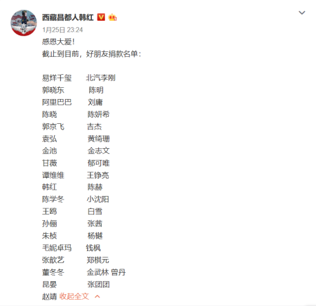 随后捐款的好友不断增多,韩红又一次更新了好友捐款的名单,更加了王一博、张靓颖等众多艺人。