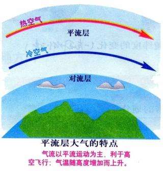 对流层上面是平流层,直到高于海平面50公里这一层,气流主要表现为水平方向运动,对流现象减弱,这一大气层叫做“平流层”,又称“同温层”。这里基本上没有水汽,晴朗无云,很少发生天气变化,适于飞机航行。在20 ~ 30公里高处,氧分子在紫外线作用下,形成臭氧层,像一道屏障保护着地球上的生物免受太阳紫外线及高能粒子的袭击。因为在同温层内部的臭氧层有吸收太阳辐射的功能,在此层的气温会随高度增加。