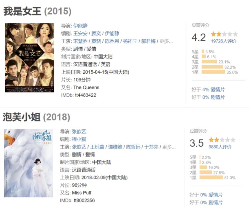 但大多数转型导演拍了一两部就放弃了。一方面,2018 年之后影视热钱退潮,资本也不愿冒险,曾经 " 流量 +IP" 的路径不再奏效。另一方面,不少演员转型的导演作品面临票房口碑双失利,比如伊能静的《我是女王》、张歆艺的《泡芙小姐》票房均不到 2000 万,成本都没收回,豆瓣仅三四分。