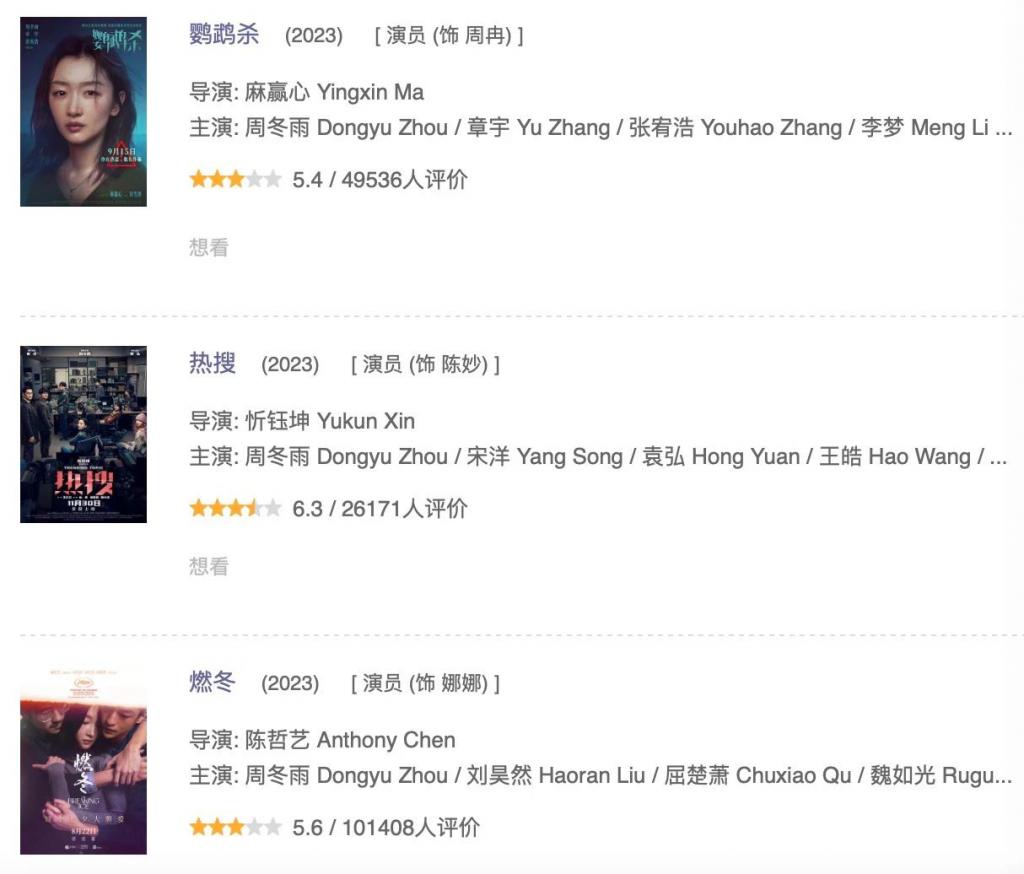 但周冬雨的三部作品《燃冬》《鹦鹉杀》《热搜》,无论是从商业还是艺术的维度看,都是失败的。豆瓣评分均低于 6.5 分,票房最高止步于 6300 多万。