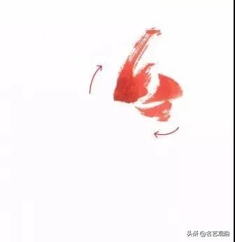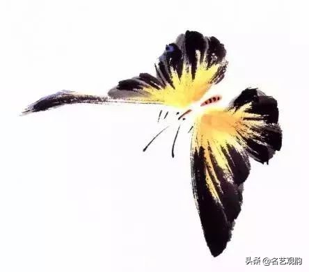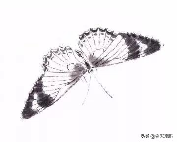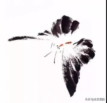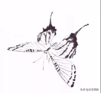 步骤四:继而写另侧后翅,整个蝴蝶四翅用笔外实内虚,留有飞白,墨色宜有变化。加画蝶身,可勾可点。↓↓↓