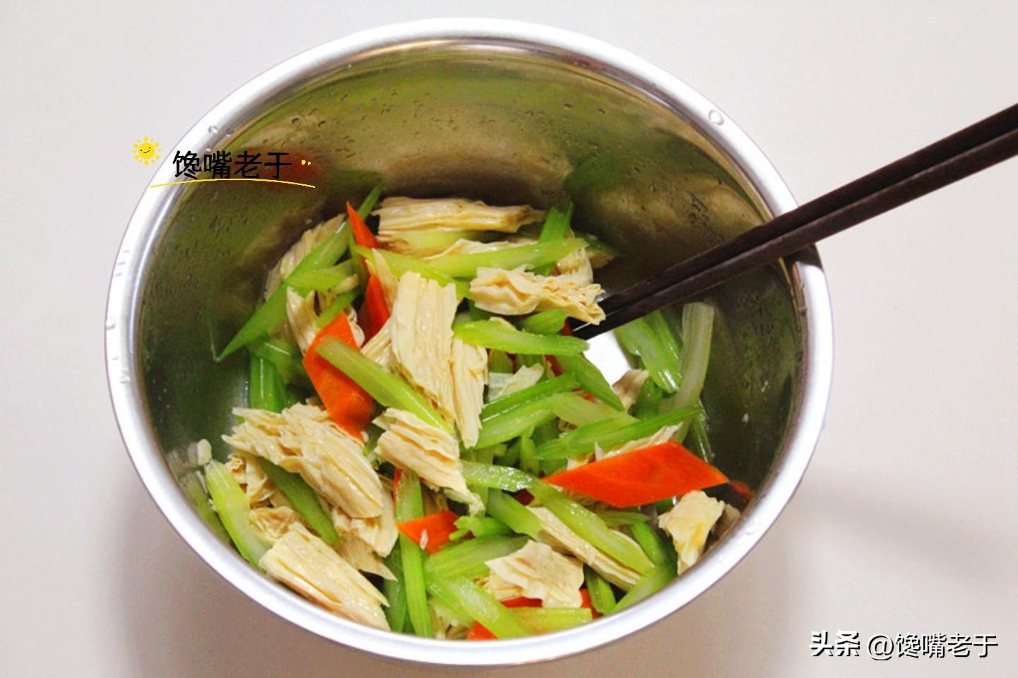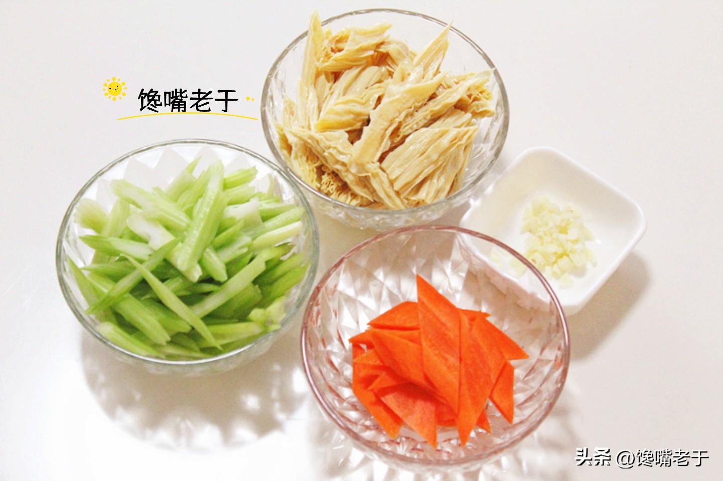 食材:腐竹、芹菜、胡萝卜、蒜、盐、鸡精、生抽、香醋、花椒油