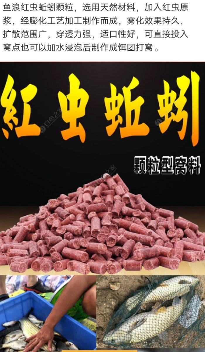 第三:红虫颗粒,他是由人工把红虫粉及其他饵料混合在一起后,进行高压压缩成型,自然颗粒就表现得比较坚硬,打窝后至少颗粒会会吸水膨胀,然后溶解,靠溶解的过程中散发红虫的腥味,来吸引鱼儿吃食,鱼来回的琢食,太硬又咬不动,或者鱼相互抢食,在水面来回前方飘荡,形成一定少量的雾化,所以也比酒米之类的窝料招来小鱼,加上小鱼喜欢腥味,窝子里数量快速成群,导致经常打窝后,有口打不到鱼,但这样也有一定的好处,小鱼敢来吃,大鱼才不会那么谨慎,大胆进食,不小心就遭了钓鱼人的道。冬季相对来说,气温低,红虫颗粒腥味突出,提前打窝,相对来说还是比较好用的,而且商城的鱼浪、好家伙颗粒等一包400g才2块多,能用几次,也十分划算的。