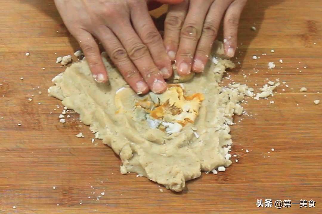 4.另外准备两个咸蛋黄和油酥面掺在一起,揉均匀、揉成团,这里加咸蛋黄吃起来更加醇香。