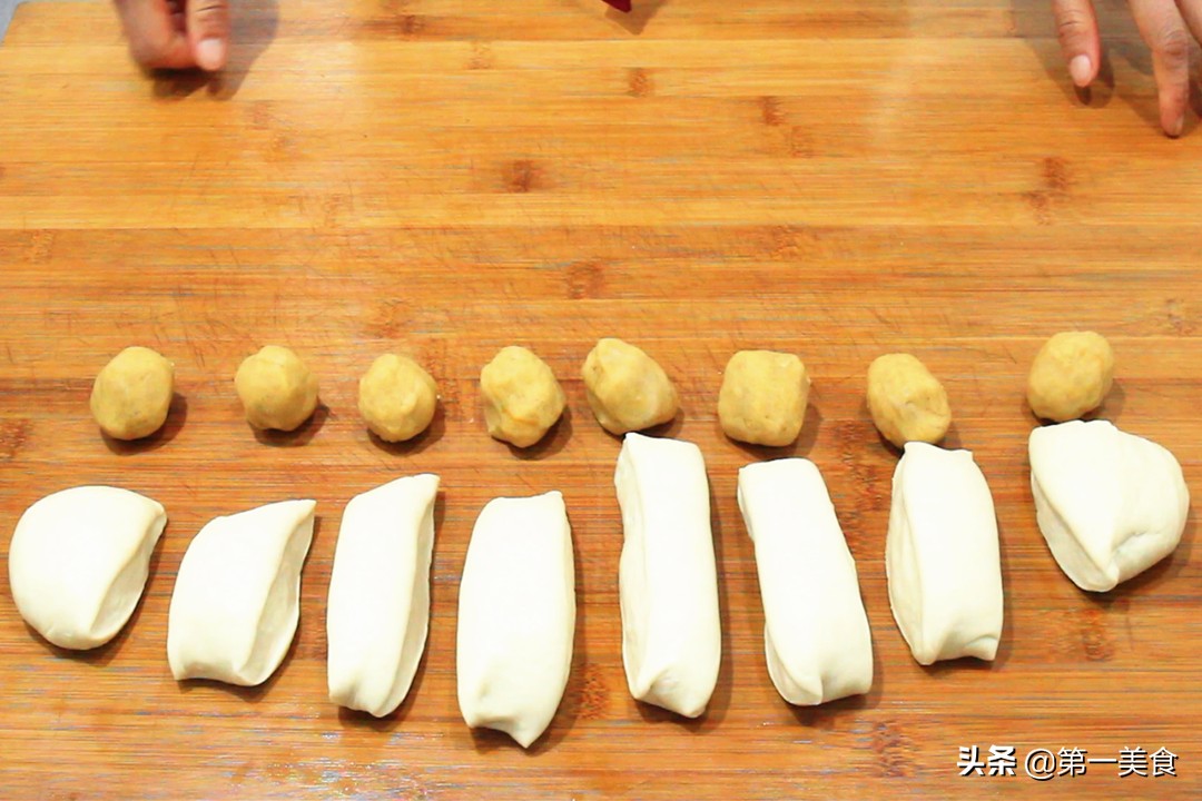 6.15分钟以后,面团和蛋黄酥都已经醒好,在案板上刷上植物油,取出面团揉搓光滑,再搓成长条,切8个大小均匀的剂子,油酥也团成8个大小均匀小球,每个油酥约20克。