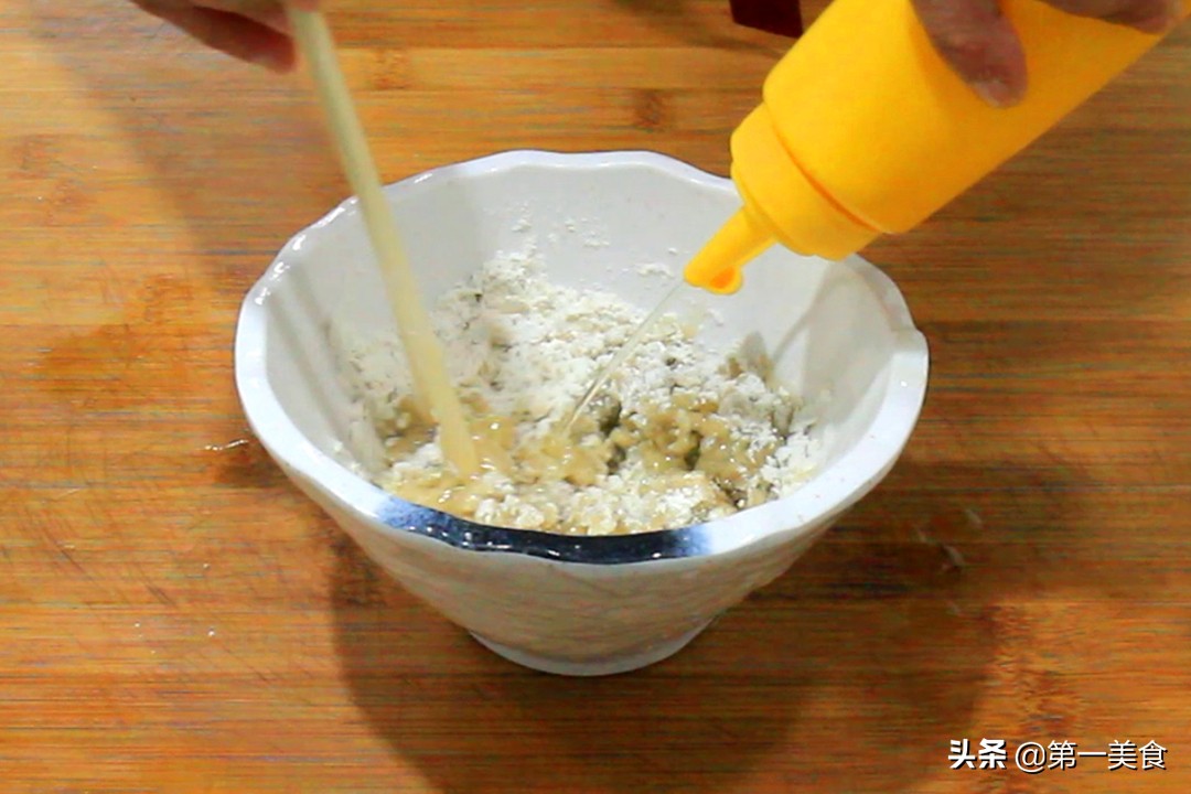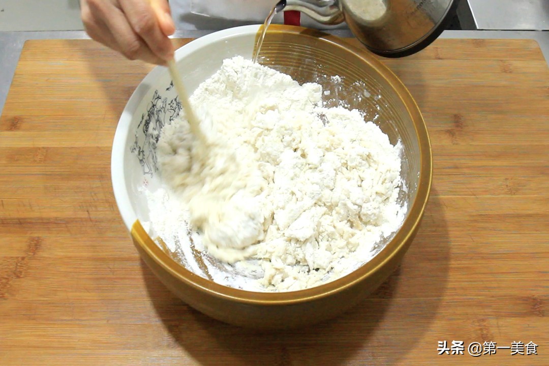 2.把面粉搅成面絮,再揉成光滑的面团,揉好以后在面团表面涂一层植物油,盖在盆中饧发10分钟,饧发过的面团更柔软、有延展性。