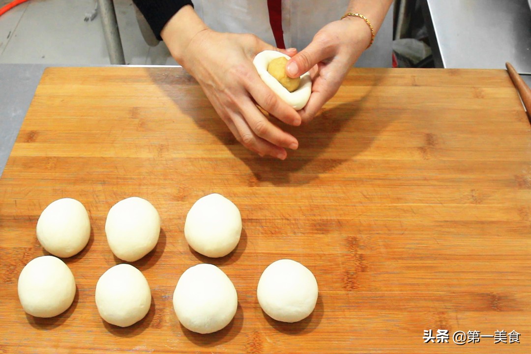 7.然后把剂子揉成团,不用擀面杖,直接放在手心压成面片、放上油酥面,把面片放在虎口处,不断转动收紧开口,所有剂子都按此方法裹好油酥。