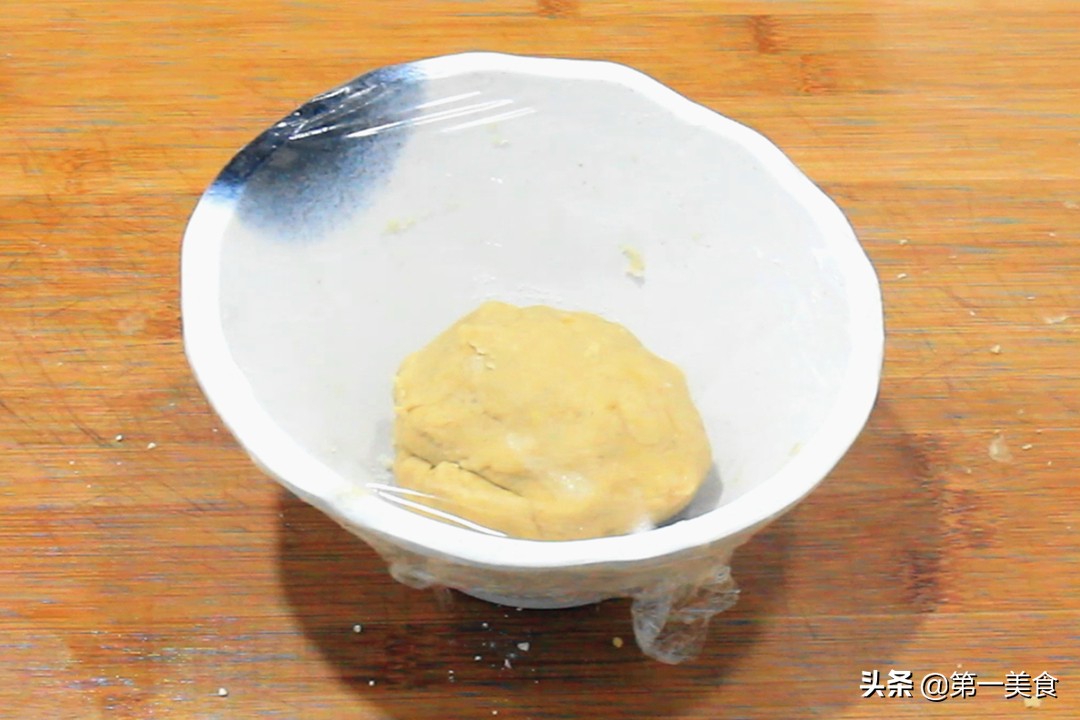 5.揉好以后把油酥面放在碗中,盖上保鲜膜也饧发10分钟。这里油酥面是饼分层的关键。