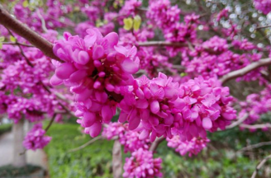 2.紫荆。不知道大家有没有看到路边绿化带上有一些看着树干明明光秃秃的,可上面却开满了很多紫红色的花,而且这花仿佛是紧紧贴合在树干上的,这就是紫荆了。小伙伴们是不是想到了我们香港的区旗上的紫荆花?其实它们也不是同一种植物。香港区花学名叫