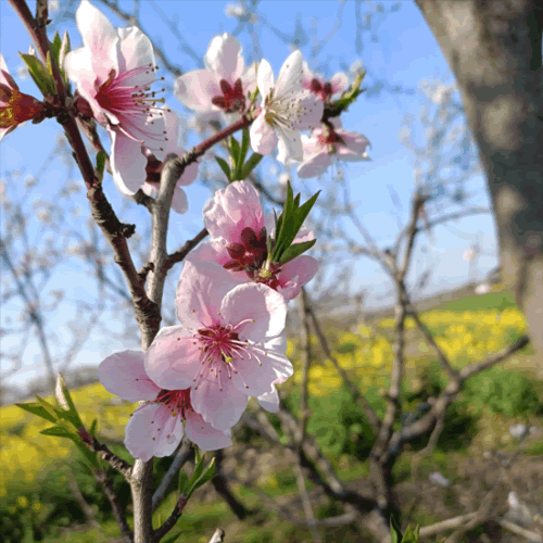 蔷薇科还有一种粉色为主的花就是桃花了。人面桃花相映红,就是对桃花最好的赞美。桃花一般也是先有花,但是它的叶片会迫不及待的长出来,所以我们大多数看桃花的时候可以说是有花也有叶。桃花是没有花柄,海棠和樱花则多为伞状花序。另外有些风景桃树开花时重瓣,花型更加美丽。