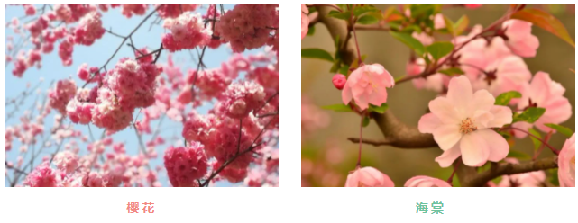 和樱花比较像的就是海棠了。海棠花也是以粉色为主,花期与樱花有重叠,栽种也较多。开花的时候也是满满一树花,非常漂亮。与樱花不同的是,海棠多为开花的时候已有一些叶片长出,而樱花一般都是在花快谢的时候才开始长叶,当然也有一些晚樱品种稍稍例外。而且海棠的花瓣一般比樱花更圆润,花瓣数量也较樱花多出1-2片,小伙伴们可以仔细的观察下。