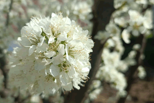 介绍完常见的粉色系蔷薇科,我们再看几种白色的,它们就是梨花、杏花、和李花。这三种颜色都是偏白,淡雅清新。李花和杏花差不多时间开放,李花一般无花柄,几乎是贴着枝丫开放,而且成簇,花量非常大,远远看去,仿佛一整个树枝都被白色的花朵包围,很是壮观。而杏花呢一般是单朵开放,花朵比较饱满,而且是先开花后长叶。梨花的花期最晚,它也是成簇状开放,但是他和李花的区别是梨花有花梗且较长,通过这个我们就很容易辨认了。
