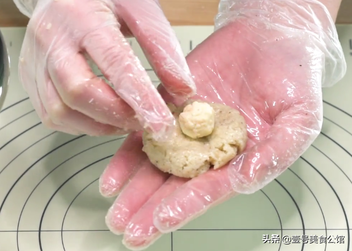 第三步:把花菜泥等分成35g左右的小剂子,分别搓圆按扁之后,包裹上一小坨搓圆的马苏里拉芝士,然后像平时包团子一样,收口搓圆。