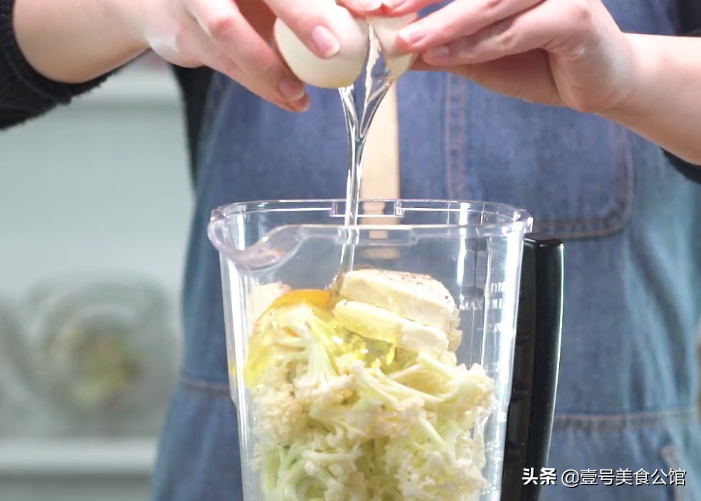 第一步:首先准备一个破壁机,把摘洗干净,剪成小朵的花菜放入其中,加入准备好的盐,胡椒粉,两个全蛋,奶酪,罗勒碎,打制成泥状备用。